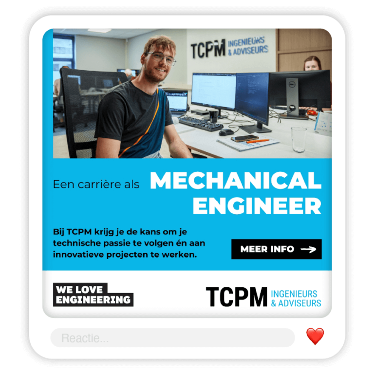 Mechanical Engineers aangenomenSamen met TCPM ontwikkelden we een sprekende Job Marketing-campagne op Facebook en Instagram. Onze content creators verzorgden een professionele video- en fotoshoot op locatie, wat unieke beelden opleverde van TCPM’s werkomgeving, projecten en collega’s. Hiermee brachten we zowel de technische expertise als de bedrijfscultuur authentiek in beeld.